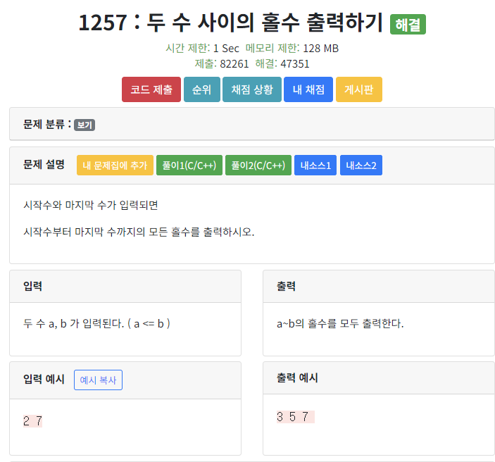[코드업 CodeUp] 1257 : 두 수 사이의 홀수 출력하기